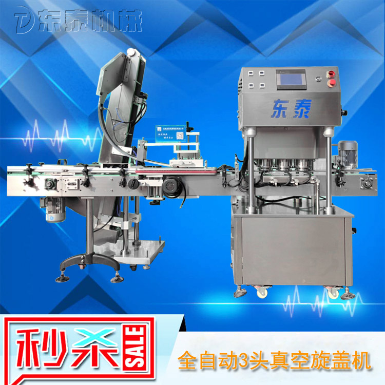 該直線式真空旋蓋機(jī)是東泰機(jī)械結(jié)合用戶使用的情況,摒棄了傳統(tǒng)轉(zhuǎn)盤式真空旋蓋機(jī)的弊端,研制開(kāi)發(fā)的新型高效設(shè)備,設(shè)備自動(dòng)檢測(cè)到兩個(gè)瓶子蓋子進(jìn)入到雙頭真空旋蓋機(jī)內(nèi),旋蓋機(jī)彩色顯示屏?xí)?shí)時(shí)顯現(xiàn)旋蓋狀況,整機(jī)多點(diǎn)檢測(cè),當(dāng)進(jìn)口無(wú)瓶無(wú)蓋、出口堵塞、定位不準(zhǔn)、瓶身傾倒均自動(dòng)停機(jī)。單個(gè)旋蓋頭達(dá)到的真空度都可以單顯示,單調(diào)整