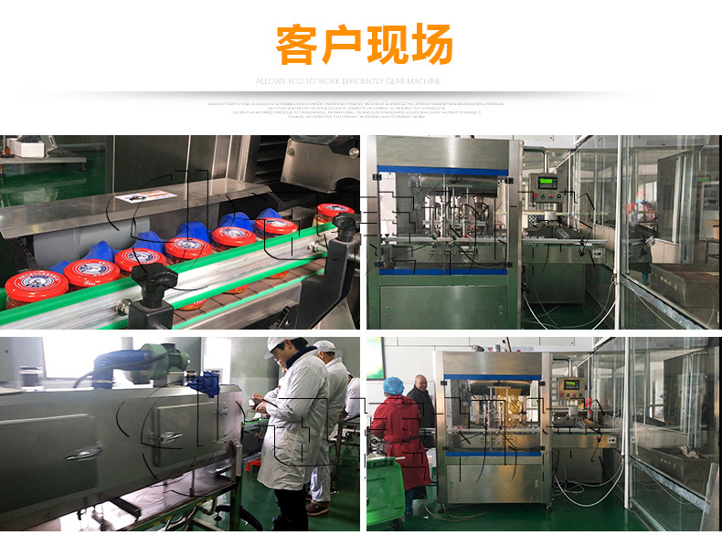 該生產(chǎn)線適合中小口徑三旋、四旋玻璃瓶調(diào)味醬的分裝,適合醬料、含顆粒黏稠物料的灌裝,物料接觸部分均采用316不銹鋼,整機304不銹鋼,符合食品衛(wèi)生標(biāo)準(zhǔn)。該機設(shè)計合理,機型小巧,立式結(jié)構(gòu),節(jié)省場地,操作方便。啟動部分均采用FESTO和臺灣AirTack的氣動元件。灌裝閥有氣動閥控制,灌裝精度更高,灌裝量和灌裝速度均可任意調(diào)整,灌裝悶頭采用防拉絲及升降灌裝裝置。