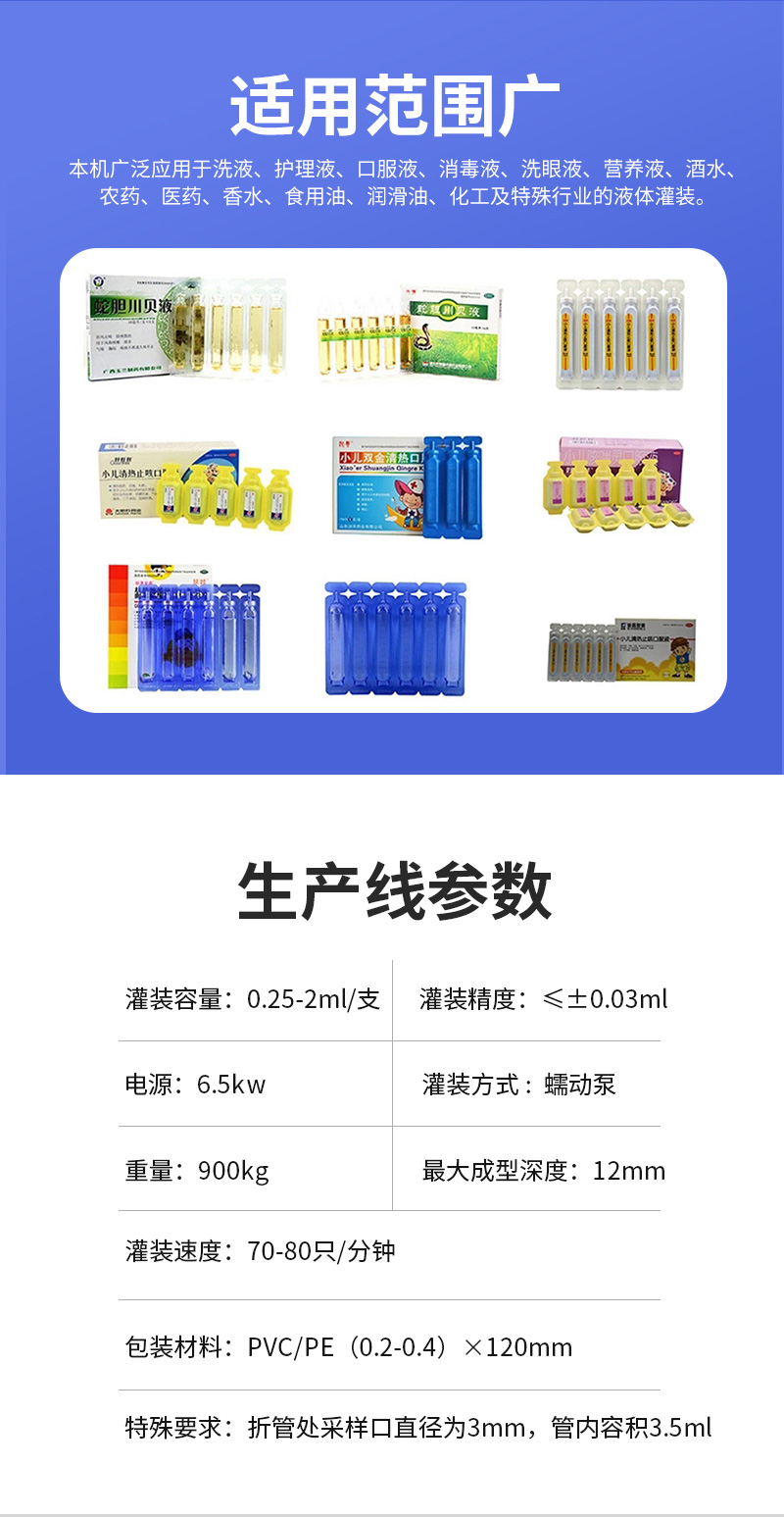 易折試劑管成型灌裝機(jī)廣泛使用于護(hù)理液、口服液、洗眼液、營(yíng)養(yǎng)液、香水、食用油、潤(rùn)滑油、化工及特殊行業(yè)的液體灌裝。