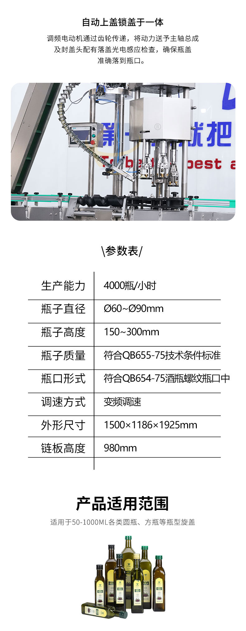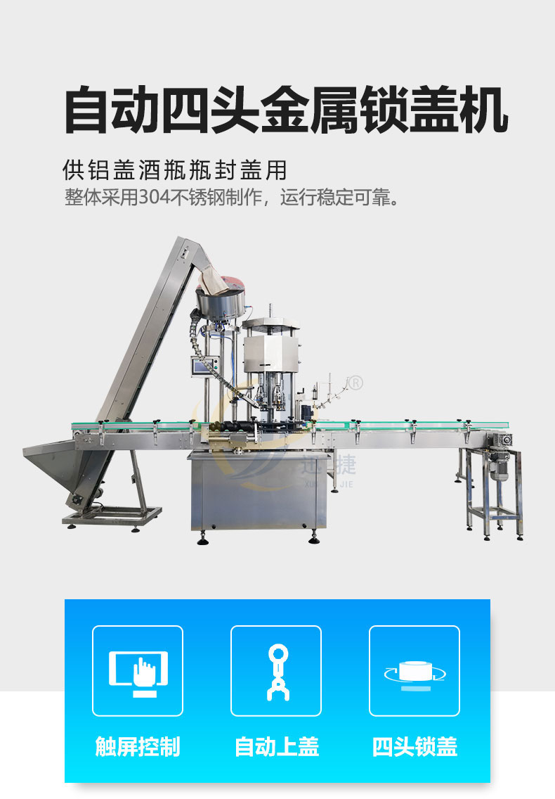 全自動四頭金屬鎖蓋機(jī)供鋁蓋酒瓶瓶封蓋用,整體采用304不銹鋼制作,運(yùn)行穩(wěn)定可靠。適用于50-100ml各類圓瓶、方瓶等瓶型旋蓋。